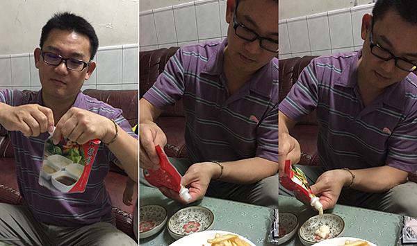 很剛好,今日公婆不在家(噓~公婆是吃素的,所以要小聲說),所以富貴仔就一直吵著要吃麥當當,那富貴木只好當個孝子去買啦!所以試吃沾醬的食材就是麥當當套餐啦~