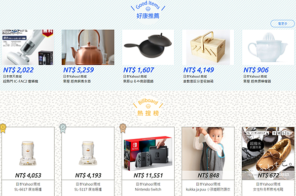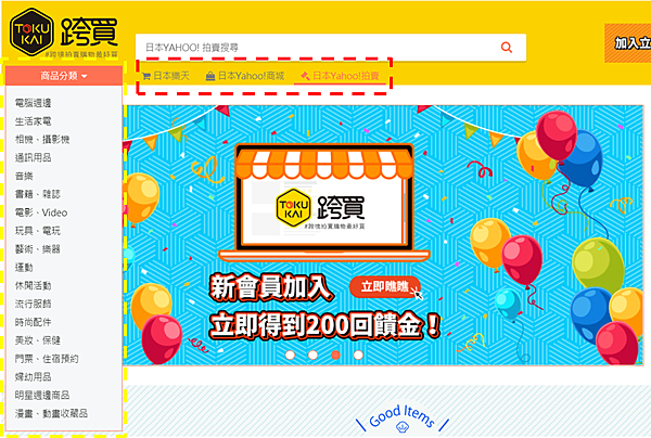 「跨買」結合了日本樂天、日本Yahoo!商城和日本Yahoo!拍賣代標服務(如網頁上方紅虛線標示),家電、服飾、配件、婦幼用品...等等,讓你眾多商品一次購足。