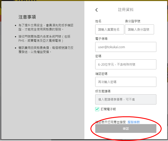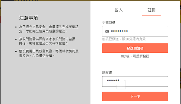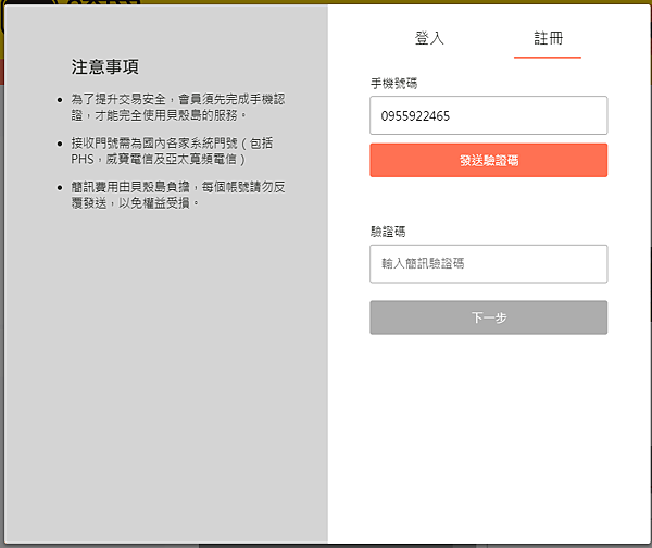 輸入您手機號碼(這也是往後登入的帳號喲!)按下發送驗證碼。
