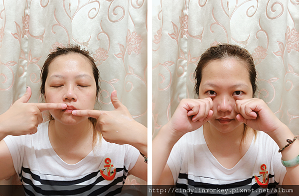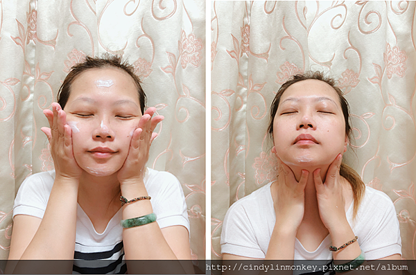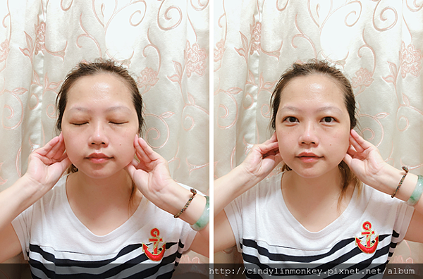大約臉兒上抹上部份,在將多餘的精華乳霜磨拳擦掌後,將臉部肌膚稍做按摩,讓精華更加的吸收進去達到吸好吸滿的滋潤緊緻度。