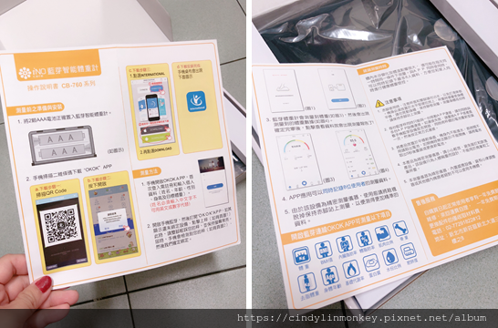 裡頭有附一張智能體重計操作說明書,操作簡單明瞭又快速,讓你輕鬆上手,健康管家隨時在您身旁呵護您